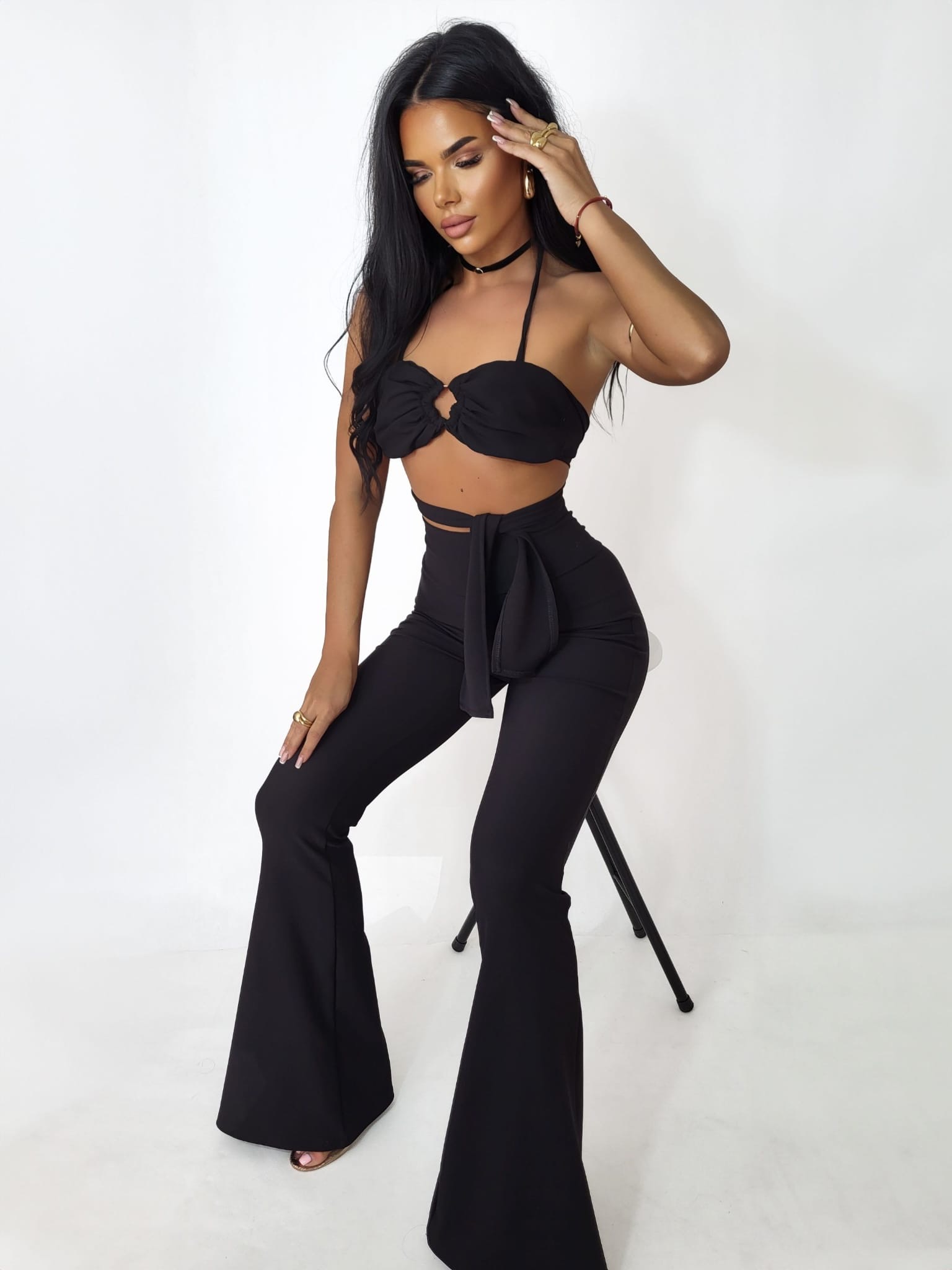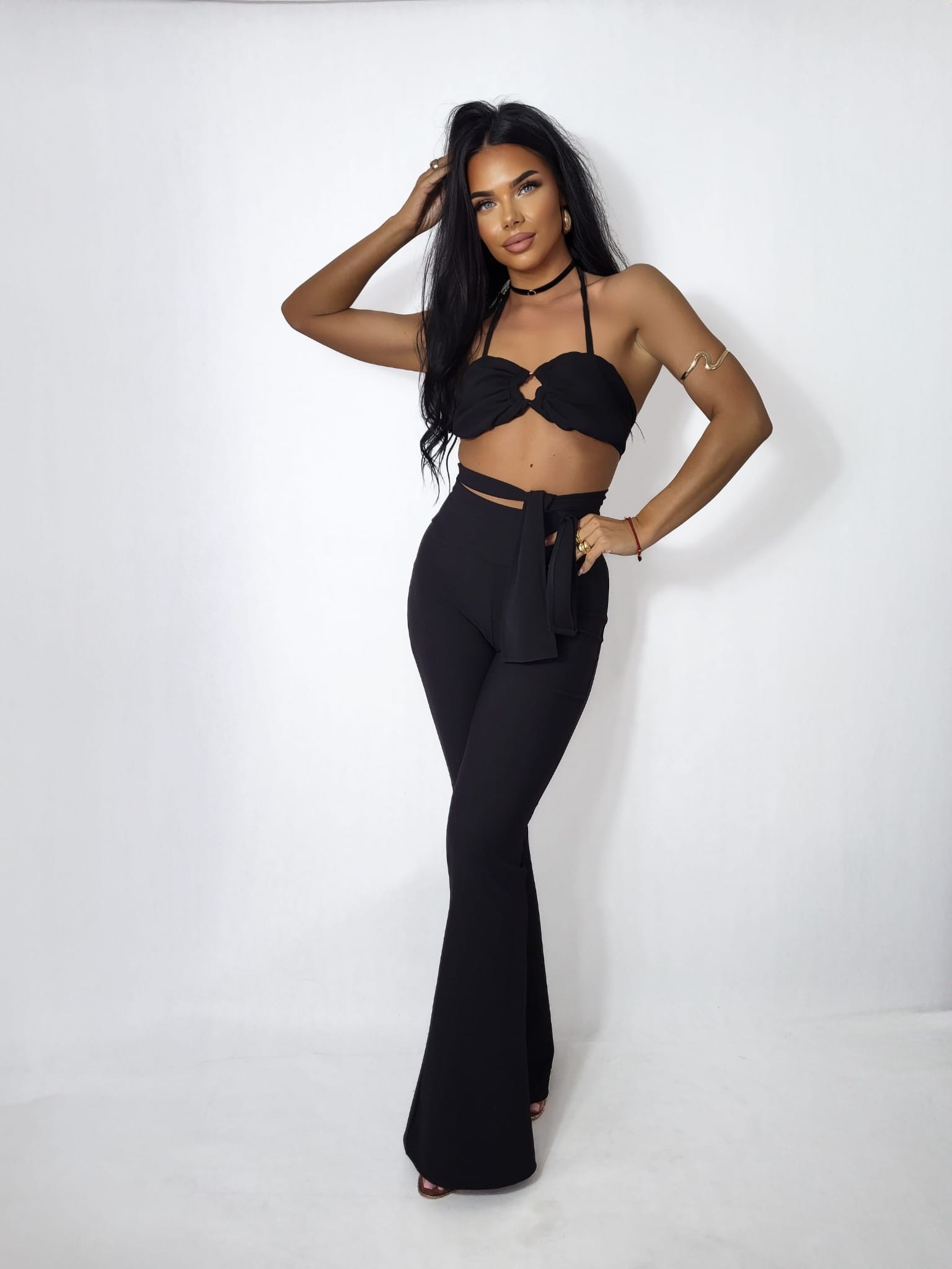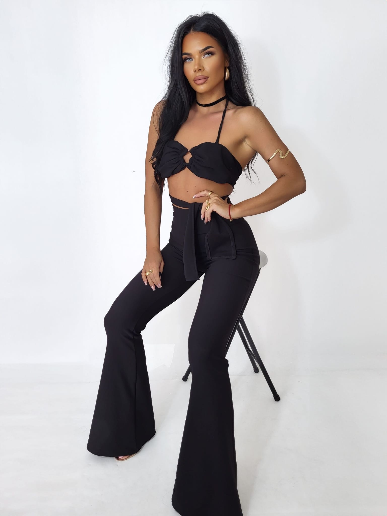 Czarny komplet dwuczęściowy składa się z eleganckich, cieniutkich prążkowanych spodni typu dzwony, które pięknie podkreślają sylwetkę i mają efekt push-up z tyłu, dodając kobiecości i zmysłowości. Spodnie są dopasowane, z szerokim rozkloszowaniem u dołu, co zapewnia wygodę i stylowy wygląd. Do kompletu dołącza top o wiązaniu na szyję, przypominający górę od kostiumu kąpielowego, co nadaje mu odważny i modny charakter. Top jest również wiązany z tyłu na plecach, podkreślając dekolt i plecy. Całość tworzy efektowny, seksowny zestaw idealny na letnie wyjścia, imprezy lub plażowe stylizacje, łącząc elegancję z odrobiną zmysłowości.